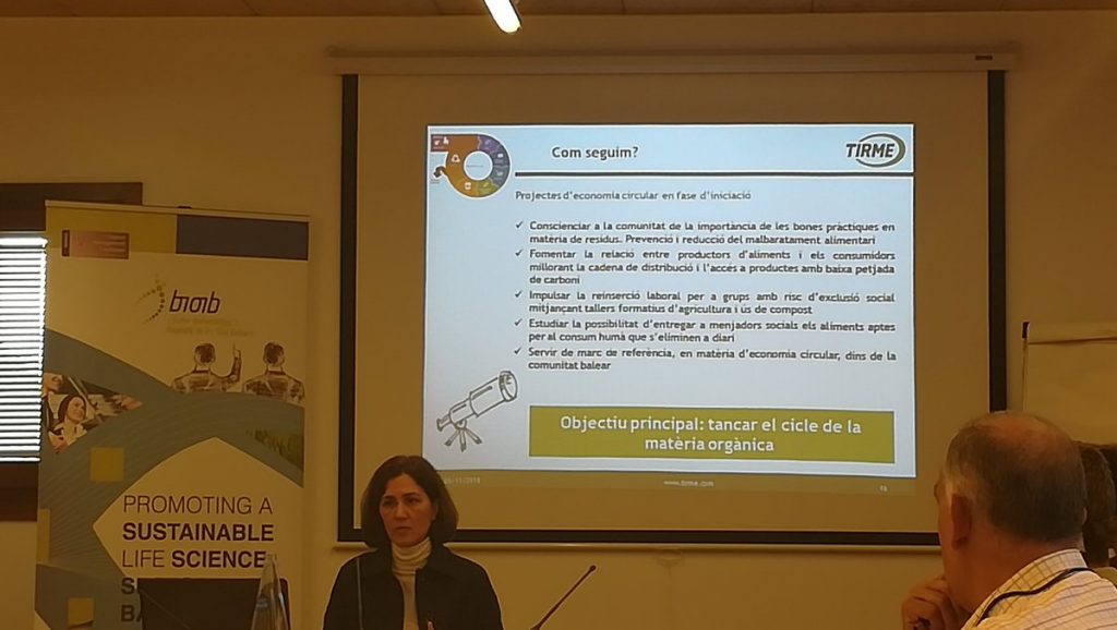 - Per finalitzar, Aina Canaleta, responsable de l’Oficina d’ economia circular i Desenvolupament Sostenible de Tirme presentà alguns dels projectes més destacats en sostenibil·litat. La bioeconomia és circular, la UE aposta per això, veure els residus com a recursos. A Tirme s’aplica la responsabilitat social, circularitat, reutilització, apostar per proveïdors locals.